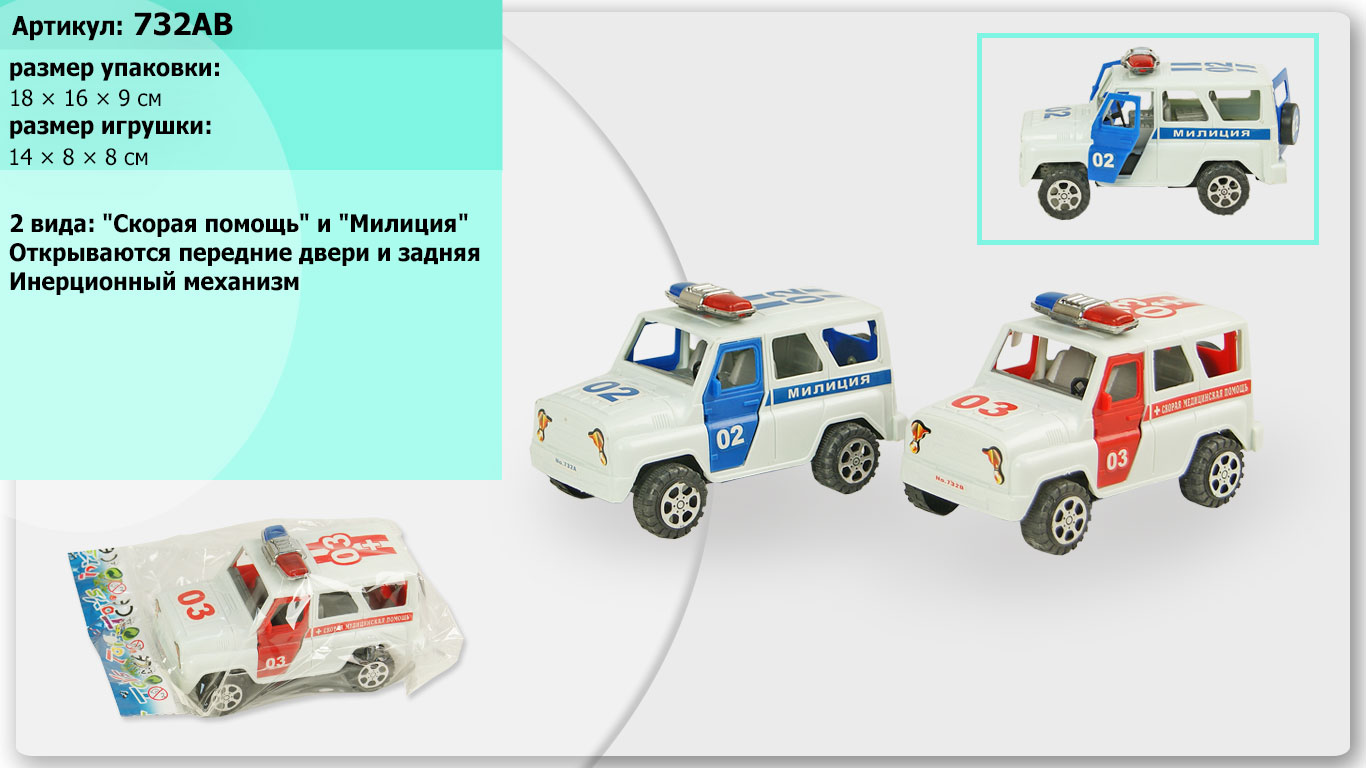 Машина инерц 732AB (300шт/2)"Милиция" 2вида,откр.,двери,в пакете 14*8см(КИ)